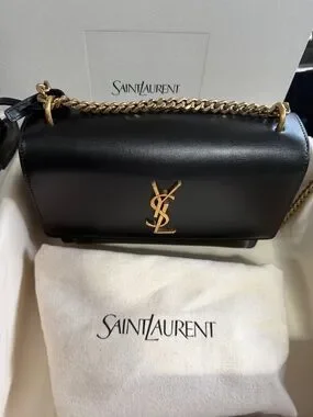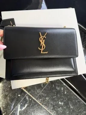 Brand new, never used or worn. Authentic Saint Laurent Sunset Medium bag in black smooth leather with gold-tone hardware. Features the iconic YSL logo, structured silhouette, and adjustable chain strap with leather shoulder pad. Includes original leather tag detail.