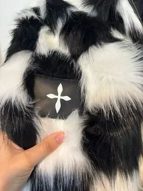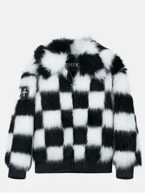 Authentic SMFK "Plan C" streetwear bomber jacket. This statement piece features a bold black and white checkered (checkerboard) pattern in incredibly soft, high-quality faux fur. Signature SMFK "Compass" cross silver-tone zipper pull and leather-style ribbed trim on the cuffs and hem.