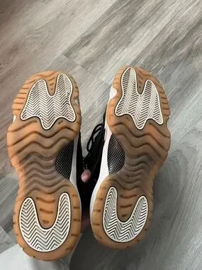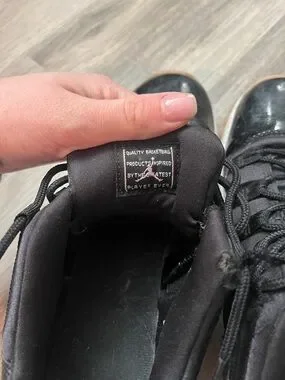 Low-top black sneakers with glossy patent accents. Padded collar and lace-up front. Contrasting white midsole and gum rubber outsole. Sleek everyday style.