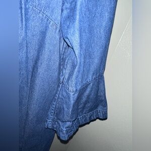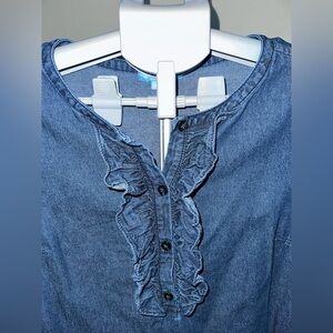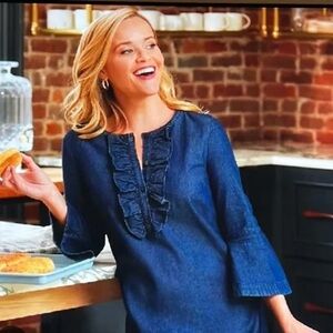 Elegant Draper James Chambray Ruffle Shift Dress. Features a ruffle button front with a flared sleeve. Perfect for casual wear.