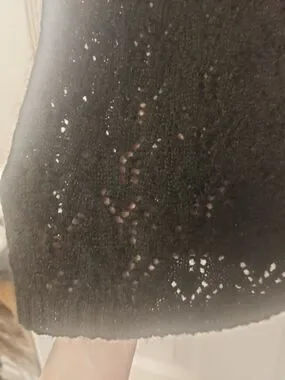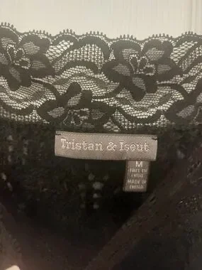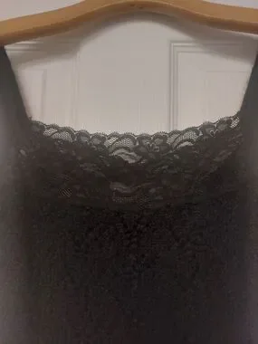 Sleek black camisole featuring a delicate lace neckline and slim straps. Soft, stretchy fabric with an open knit crochet look offers a comfortable, flattering fit. Layer under jackets or wear solo for a polished look. Easy to style for day or evening in classic black.