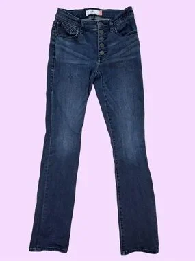 Classic straight-leg jeans in dark blue denim. Button-fly front adds vintage detail. Subtle whiskering and fade for depth. Clean hem and versatile silhouette. Loved but taken care of, sold as is.