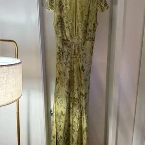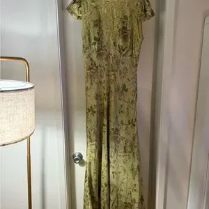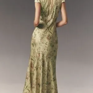Elegant maxi with delicate lace bodice. Soft floral print on a pale green satin base. Cap sleeves and a fitted silhouette. Romantic, vintage-inspired look.
