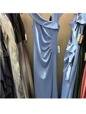 Make an entrance in this elegant Xscape light blue periwinkle evening gown, NWT, size 6. Designed with a timeless off-the-shoulder neckline, this gown beautifully highlights the collarbone while creating a soft, sophisticated silhouette that flatters effortlessly