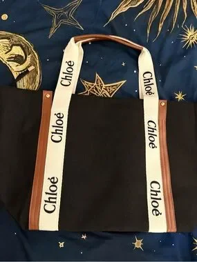 New Chloe logo black canvas tote featuring cream logo straps and brown leather trim. Simple, versatile design for everyday use. Durable canvas construction with comfortable top handles. Stylish branding adds a designer touch.