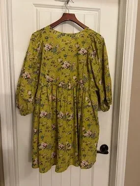 Bright chartreuse dress with delicate pink and blue floral print. V-neckline and subtle button detail. Feminine, flowing silhouette with soft gathers. Lightweight fabric with a casual, romantic feel.