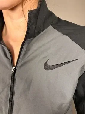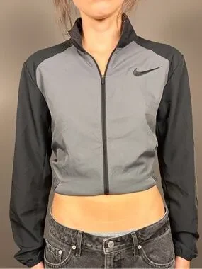 Lightweight cropped track jacket from Nike. Full-zip front with stand collar. Black sleeves and gray body for a sporty contrast. Subtle Nike swoosh on chest. Comfortable for layered casual looks.