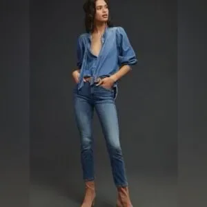 Clean five-pocket styling and a mid-rise waist. Stretch denim for easy movement. Polished look that pairs with boots or tops.