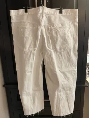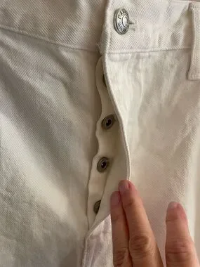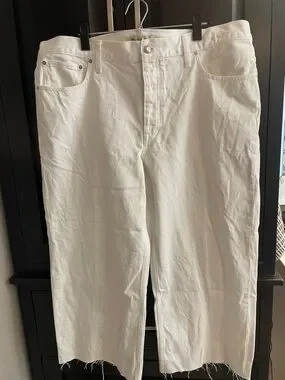 Crisp white, relaxed, wide, straight-leg jeans from Madewell. Button-fly, five-pocket design and low-slung. Raw frayed hem detail.