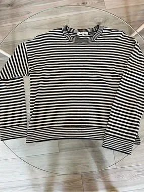Soft knit crewneck with classic horizontal stripes. Long sleeves and a relaxed, boxy silhouette. Lightweight and easy to layer. Timeless wardrobe staple.