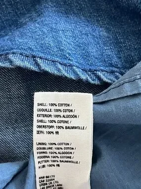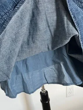 Sleeveless halter neckline. Relaxed swing silhouette. Classic blue denim color. Simple stitched detailing. Versatile casual dress.