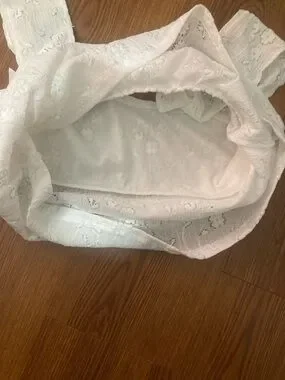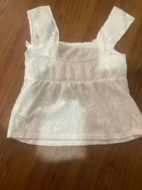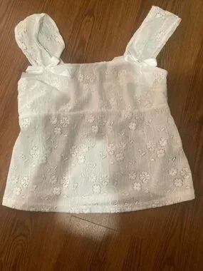 Delicate floral lace camisole. Features wide lace straps with small bow accents. Soft, feminine silhouette. Lightweight and airy for warm days.