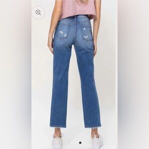 90'S VINTAGE STRAIGHT JEAN T5423 COMFORT STRETCH DENIM, HIGH RISE WAIST, 90'S VINTAGE STYLE, DISTRESSED DETAIL, CROPPED LENGTH, STRAIGHT LEG JEANS F. RISE: 11 1/2" / INSEAM: 27 1/2'' / LEG OPENING: 15 1/2''