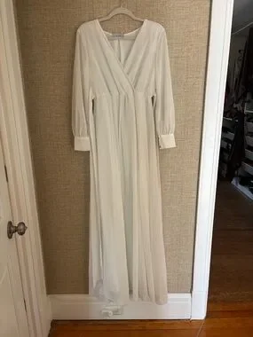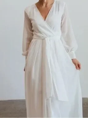 Lightweight white wrap maxi dress with a V-neck. Long sheer sleeves with cuffed wrists. Self-tie waist for a flattering fit. Flowing skirt for elegant movement. Clean, minimalist design for versatile wear.