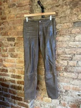 Genuine slim-fit brown genuine leather pants. Clean front with pocket details. Sleek, tailored silhouette. Versatile wardrobe staple.