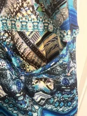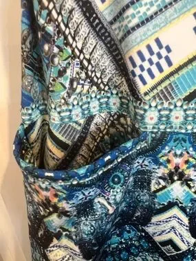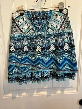 Vibrant blue multi-pattern mini skirt. Tiered hem with chevron and geometric prints. Lightweight, flowy fabric. Bold turquoise and navy colorway.