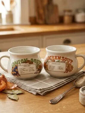 Boost your retro kitchen collection with this 2-piece set of vintage ceramic soup mugs. Featuring detailed, colorful graphics of French Onion and Chicken Soup recipes, these wide-mouth crocks are perfect for farmhouse or cottagecore decor.