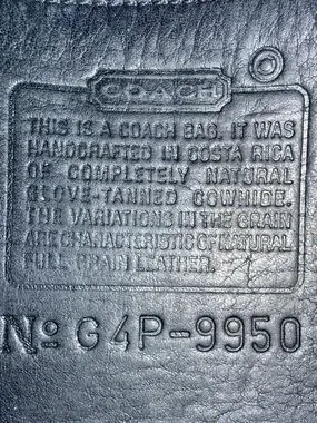 Smooth navy leather body with clean lines. Adjustable black shoulder strap. Subtle Coach tag for branding. Classic shape for everyday use.