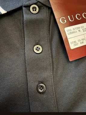 Gucci men’s polo in navy with bold white horizontal stripes. Crafted for a clean, modern look with a classic polo collar. Easy-to-wear design that pairs well with jeans or chinos. Features visible Gucci branding on the chest.