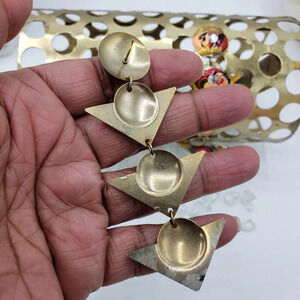 Triangle shapes all lined up to for lengthy earrings. Colorful earrings with resin over a metal base. From the 70s.