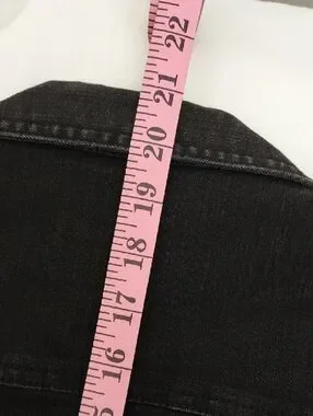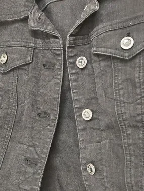 - Fit/Style: Trucker jacket, button front, two chest pockets, cropped