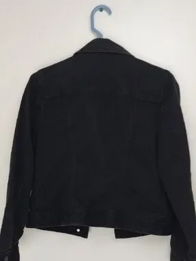 The black denim jacket that decided plain buttons weren't enough. Rhinestone hardware on a stretch denim trucker -- the kind of jacket that works on its own but plays well with everything else in the closet.