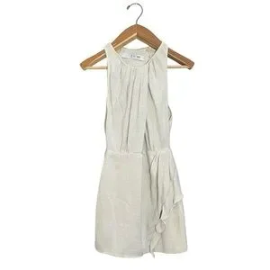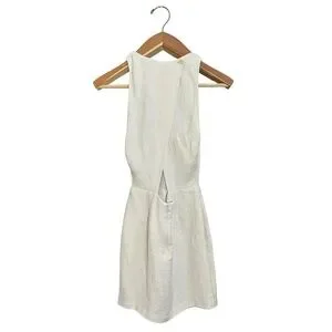 This stunning white mini dress by IRO features a chic asymmetrical wrap design with a halter neckline and a stylish cutout at the waist. The sleeveless sheath silhouette is enhanced by a ruffled skirt, making it perfect for cocktail occasions or date night