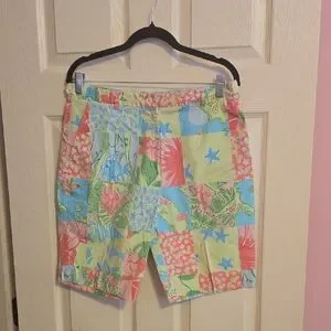 Lilly Pulitzer women's bermuda shorts. Bright patchwork print with coral florals, aqua starfish, and lime accents. Lightweight, casual summer style. Elastic waistband with belt loops. Vibrant resort-ready look.