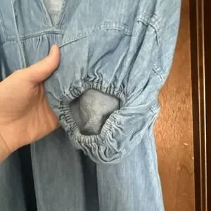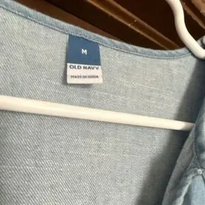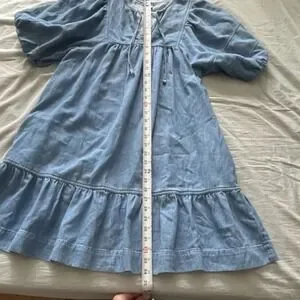 Old Navy Blue Denim Shift Dress M Puff Sleeve V-Neck Knee Length Tie Ruffle