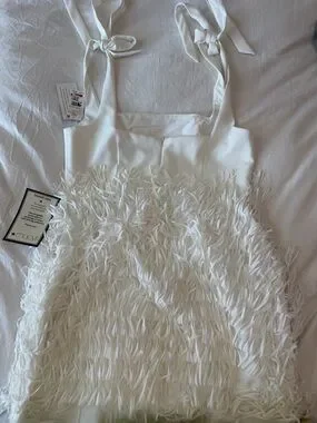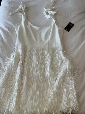 Elegant white mini dress with feather-trim skirt. Tie-shoulder straps add a delicate touch. Sleek fitted bodice for a flattering silhouette. Perfect for parties and special nights out.