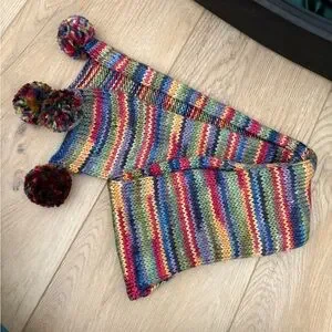 Colorful chunky knit scarf made from 100% acrylic fiber. Four Pom Pom details, two at each end. New without tag. Contains red, orange, yellow, blue, green, and purple.