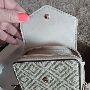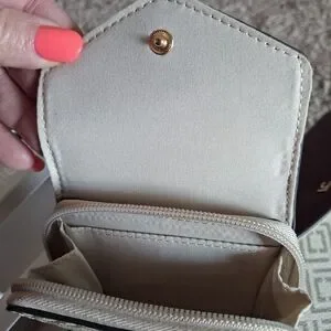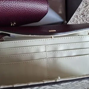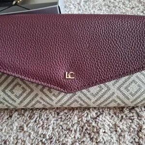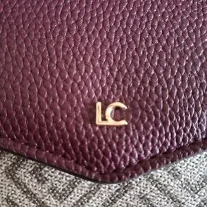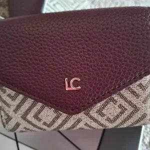 Pebbled leather wallet and matching key/card case. Gold-tone LC logo and hardware accents. Compact, stylish pieces for daily use. Rich plum color pairs with signature patterned fabric. Versatile set for organized essentials.Box is damaged but wallet& card case are secured in
