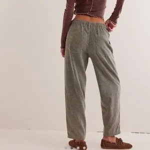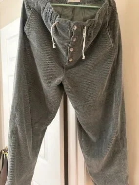 Relaxed fit corduroy pants with button-front detail. Elastic waist with branded drawstring. Soft textured fabric and roomy legs. Easy casual style for everyday wear.