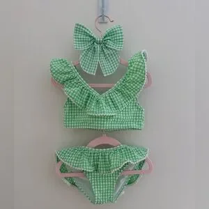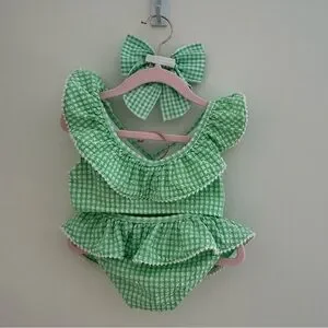 Two-piece swimsuit with mint green gingham pattern. Ruffle trim along edges. Includes matching bow. Lightweight textured fabric for swim play.