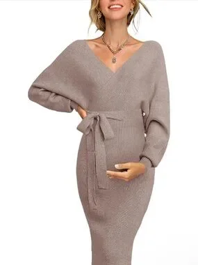 V-Neck Belted Maternity Sweater Dress in Taupe