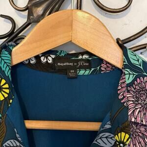 A rare collaboration piece from J.Crew and Birmingham-based designer Abigail Borg, known for her lush, hand-drawn floral prints. This shirt dress is a versatile day-to-evening style with an artful mix of retro charm and modern femininity. The vivid jewel-toned florals pop against the black base, offering a flattering, timeless silhouette.