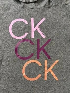 Calvin Klein Performance, CK, sweatshirt dress, hooded dress, hoodie dress, heather gray, athletic, athleisure, loungewear, school outfit, girls size 16, youth XL, big girls, casual, short sleeve, graphic logo, pink, purple, rose gold, metallic, pockets, cotton blend, soft, cozy, activewear, sporty, designer, mini dress, spring fashion, back to school, excellent used condition, EUC, authentic, branded, comfortable, relaxed fit, pullover