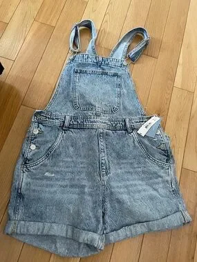 Light wash denim short overalls with a front bib pocket. Adjustable shoulder straps and side button closures. Cuffed shorts and front pockets for casual wear. Subtle distressed detail for a relaxed look.