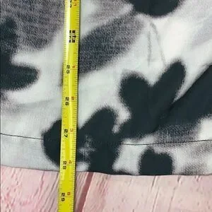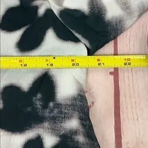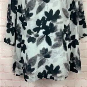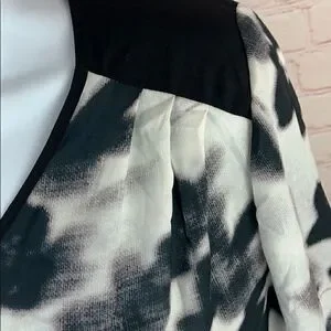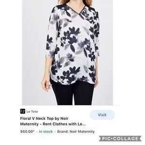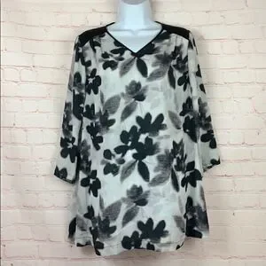 Noir maternity for Le Tote – V-neck, semi sheer abstract floral, three-quarter sleeve, black & cream tunic top in women’s size medium.