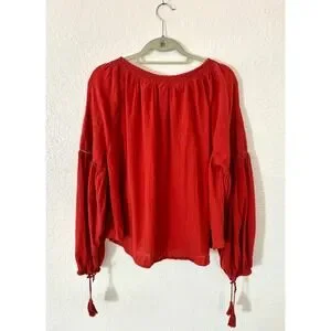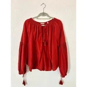 Soft 100 % cotton gauze blouse by DÔEN in the Rooibos colorway. Smocked neckline, billowy sleeves, tassel-tie front, and light embroidery throughout. Classic bohemian silhouette in excellent condition. Size small.