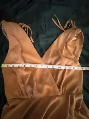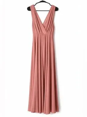 Description: Elegant Lulu’s maxi dress in a soft dusty rose shade with a plunging surplice neckline, tie shoulder straps, and a flowing full-length silhouette. A beautiful choice for bridesmaid wear, weddings, formal events, galas, or other special occasions.