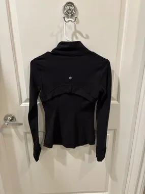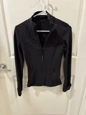 Sleek black zip-up jacket from lululemon athletica. Slim fit with contoured seams. Full front zipper and high collar. Zippered hand pockets. Stretch fabric for movement.