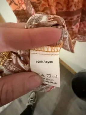 This rust/orange floral + paisley print dress gives major Free People / boutique vibes. Features a flowy silhouette with a detailed mixed-print panel and border hem — super flattering and perfect for summer styling.
