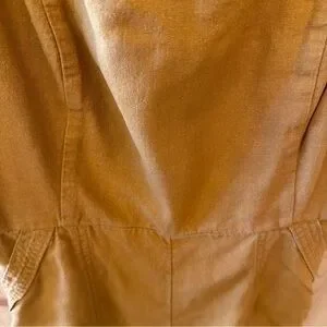 Mustard/gold romper by Old Navy featuring a flattering square neckline with wide shoulder straps. Designed with a structured bodice, seamed waist, and front pockets for a casual utility-inspired look. Crafted from a breathable linen & rayon blend, making it lightweight and perfect for warm weather. Finished with subtle top-stitching and a relaxed short-length fit. The Back shirred elastic smocking.