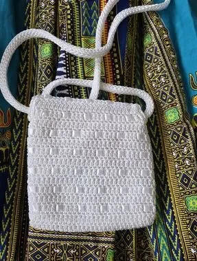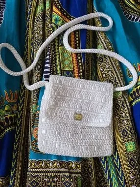 Textured white crochet crossbody from The Sak. Features a braided shoulder strap and flap closure with small gold logo plaque. Lightweight and casual for everyday wear. Simple, breathable knit adds subtle interest.