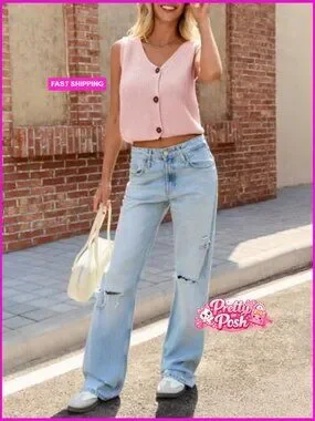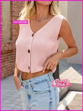 Cropped Sweater Vest V Neck Button Down Chunky Knit Sleeveless Tank Top
