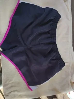 Danskin athletic shorts in black with pink trim. Elastic waistband for a secure fit. Lightweight, breathable fabric for movement. Sporty contrast piping for style.
