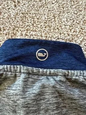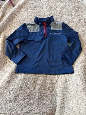 Navy pullover with gray shoulder panels. Red quarter-zip adds a pop of color. Small Vineyard Vines logo on chest. Lightweight and easy to layer.