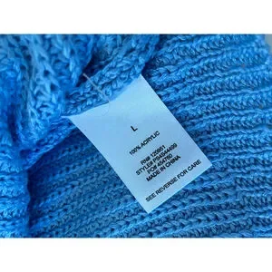 Like new , women's cropped cardigan sweater by PINK ROSE, size L. It features a V-neckline and long sleeves with ribbed cuffs. The sweater is a light blue color with a visible knit texture and three light brown, circular buttons down the front. The material tag indicates it is 100% acrylic and made in China. Measurements show a length of approximately 16 inches from shoulder to hem and a chest width of about 18 inches when laid flat