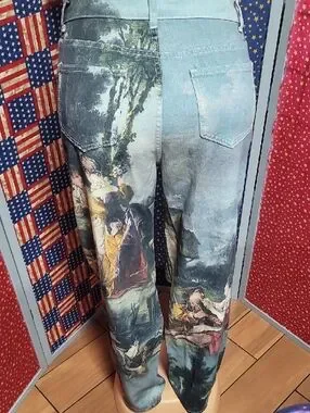 Straight-leg women's jeans with all-over classical art print. Subtle washed blue denim base. Vibrant multi-color painted scenes on front panels. Five-pocket style with belt loops. Eye-catching statement piece for casual looks.